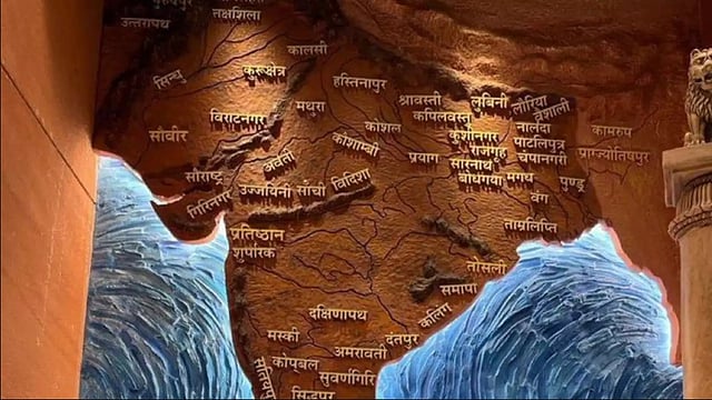The mural in the new Parliament building, inaugurated by Prime Minister Narendra Modi on Sunday, marks important kingdoms and cities of the past.