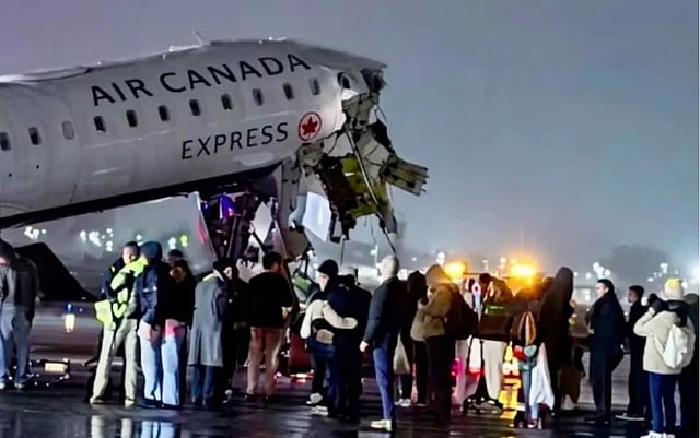 New York | An Air Canada flight collided with a Port Authority vehicle after landing at LaGuardia Airport on Sunday, according to authorities, leaving the aircraft with a crushed nose pointing upward and the rear section dropped down to the runway as officials worked to confirm details of the accident.