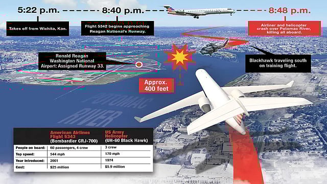 Less than 30 seconds before the crash, an air traffic controller asked the Army helicopter if it had the American Airlines plane in sight, and the military pilot responded that he did. The controller then instructed the Black Hawk to pass behind the jet. Seconds after that last transmission, the two aircraft collided in a fireball.