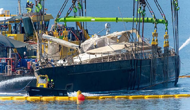 The Bayesian is missing its 72-meter (236-foot) mast, which was cut off and left on the seabed for future removal. The mast had to be detached to allow the hull to be brought to a nearly upright position that would allow the craft to be raised.