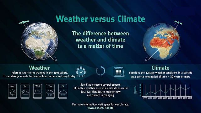 Weather is the short-term behaviour of the atmosphere – the temperature on a given day, the wind, whether it's raining and how much. Climate is about long-term statistics of weather events – the typical temperature in summer, or how often thunderstorms or floods happen each decade.
