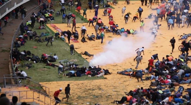 A stampede erupted at the stadium gates as mourners fled, injuring an unknown number of people, while leaders present remained locked inside a room for safety.