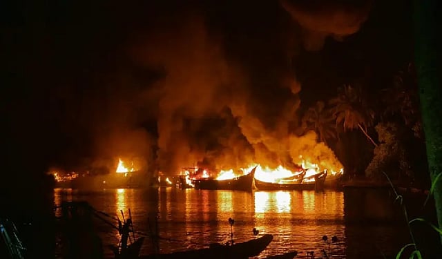 Kollam (Kerala) | Around 10 fishing boats, anchored in Ashtamudi Lake here, were gutted as a massive fire broke out in the early hours of Sunday, police said.