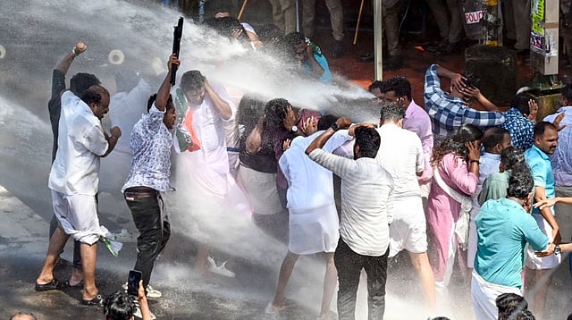 Thiruvananthapuram | A Youth Congress protest march to the secretariat demanding the resignation of Kerala Chief Minister Pinarayi Vijayan over LDF MLA P V Anvar's allegations against top IPS officers in the state turned violent as police used water cannons on the protestors and lathi-charged them.