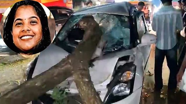Thrissur (Kerala) | A 28-year-old woman died after a container lorry hit a tree branch leaning towards the road, causing it to fall on a car at Kadavallur here, police said on Friday.