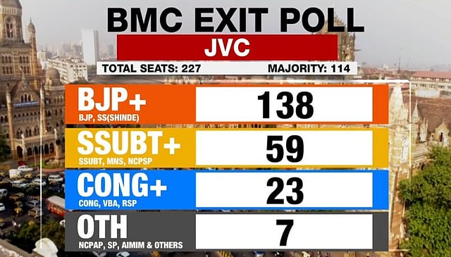 As per the JVC exit polls, the BJP-Shiv Sena alliance could win 138 seats and bag vote share in the range of 42-45 per cent in the metropolis. The Shiv Sena (UBT)-MNS-NCP (SP) alliance could win 59 seats and get vote share in the range of 34-37 per cent. The Congress-led alliance could win 23 seats and get a vote share of 13-15 per cent.