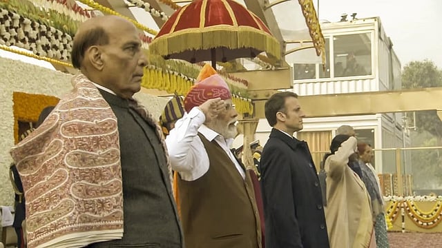 New Delhi | French President Emmanuel Macron on Friday watched India's 75th Republic Day celebrations at the majestic Kartavya Path, joining a select group of global leaders to have graced the nation's biggest ceremonial in the last seven decades.