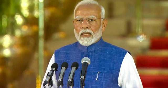 New Delhi | Prime Minister Narendra Modi was sworn in for a third consecutive term at the Rashtrapati Bhavan here on Sunday. President Droupadi Murmu administered the oath of office to the prime minister. Modi, 73, first became prime minister in 2014 and then returned to office in 2019. He is the second prime minister after Jawaharlal Nehru to have a third consecutive term. Top leaders from India's neighbourhood and the Indian Ocean region were special guests at the function.