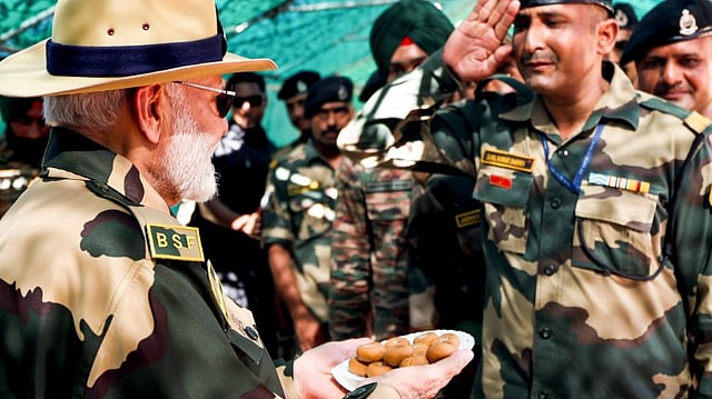 Keeping up his tradition of celebrating the festival with soldiers, Prime Minister Narendra Modi visited Sir Creek near the Indo-Pak border in Gujarat's Kutch district and offered sweets to jawans.