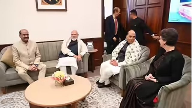 Defence Minister Rajnath Singh, Union Ministers K Ram Mohan Naidu, Rajiv Ranjan Singh 'Lalan', Chirag Paswan, and Pralhad Joshi joined the Speaker over tea.