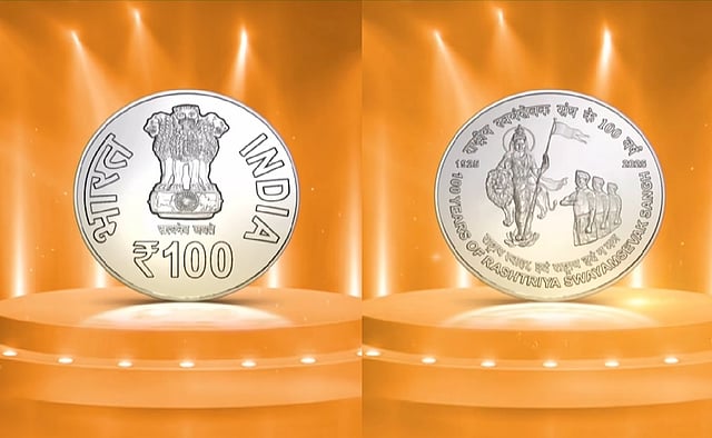 The Rs 100 coin features the national emblem on one side and on the other side it depicts a majestic image of Bharat Mata in Varada Mudra with a lion, while swayamsevaks are shown bowing before her in devotion and dedication.