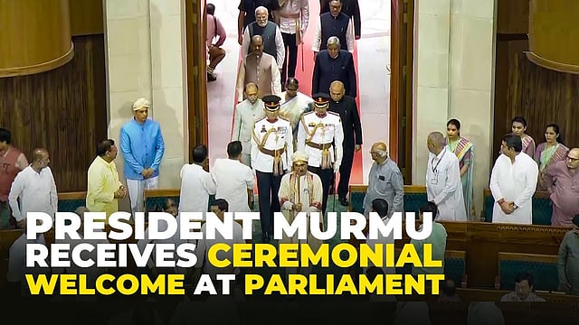 The vice president, the prime minister and the Lok Sabha Speaker welcomed the president at the Gaja Dwar of the Parliament building and proceeded to the Lok Sabha chamber in a procession led by the officer carrying the 'Sengol' reverentially.