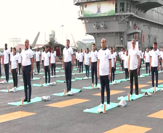 Kochi | Defence Minister Rajnath Singh on Wednesday joined hundreds of Navy personnel on board INS Vikrant, India's first indigenously built aircraft carrier here, to participate in the yoga celebrations on the occasion of the International Day of Yoga.