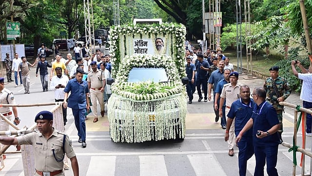 A flower-decked open carriage carried the mortal remains from the airport to Soren's residence in Morabadi area of Ranchi, with the chief minister and his legislator brother seated beside his father's body throughout the procession.