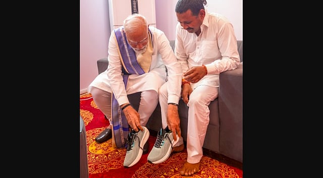 Modi shared a video on X of his meeting with Rampal Kashyap, whom he gifted a new pair of shoes and also helped to put them on.