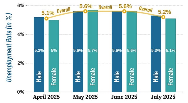Joblessness among the youth, those in the age group of 15-29, decreased to 14.9 per cent in July from 15.3 per cent in June 2025.
