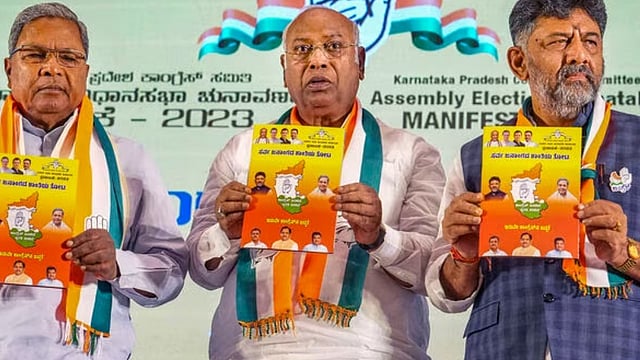In the manifesto -- 'Sarva Janangada Shanthiya Thota' (Peaceful garden of all communities) -- released by Congress President M Mallikarjun Kharge in the presence of the state unit chief D K Shivakumar and CLP leader Siddaramaiah, among others, the oppposition party reiterated its five guarantees -- 'Gruha Jyothi', 'Gruha Lakshmi', 'Anna Bhagya', 'Yuva Nidhi' and 'Shakti'.