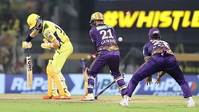 Conway top-edged a pull to Rinku Singh in the deep off Thakur after making 30. Ambati Rayudu's poor season continued as he fell for just 4 to give Narine his first wicket.