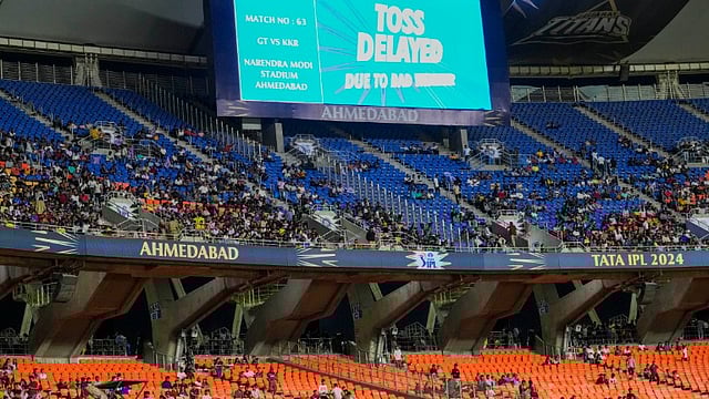 The toss didn't happen at scheduled time of 7 pm due to incessant lightning, which was followed by slight drizzle that became heavier as time passed by.