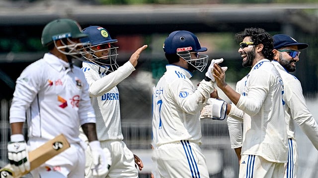 Brief scores: Bangladesh 233 all out and 146 all out in 47 overs (Shadman Islam 50; Ravichandran Ashwin 3/50, Ravindra Jadeja 3/34, Jasprit Bumrah 3/17) vs India 285/9 declared in 34.4 overs (Yashasvi Jaiswal 71, KL Rahul 68, Shakib Al Hasan 4/78, Mehidy Hasan Miraz 4/41).