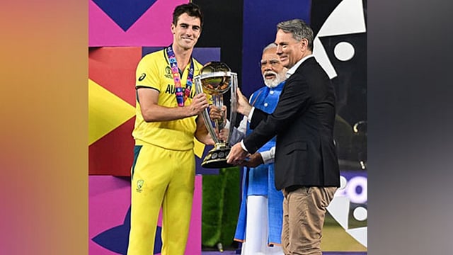 PM Modi was joined by Australia's Deputy PM Richard Marles to present Australia captain with the winning trophy after their record-extending World Cup title victory.