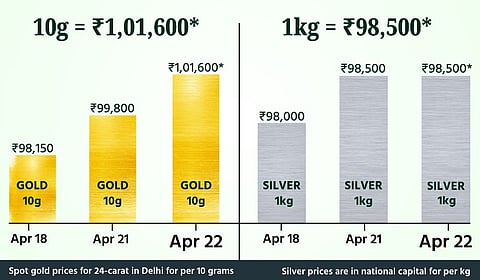New Delhi | Gold prices surged by Rs 1,800 to zoom past the crucial Rs 1 lakh-mark for 10 grams in the national capital on Tuesday amid buying rush by local jewellers and stockists in anticipation of increased demand during Akshaya Tritiya and wedding season even as global macroeconomic uncertainties continued to fuel safe-haven chase.