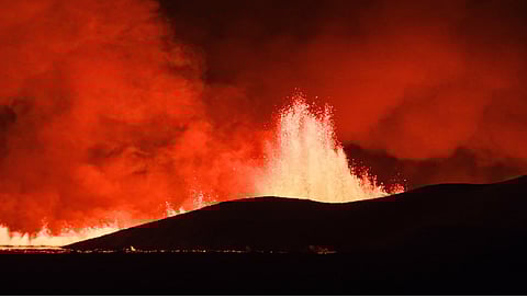 London | Iceland's Meteorological Office says a volcano is erupting in the southwestern part of the country, sending semi-molten rock spewing toward a nearby settlement for the third time in recent weeks.