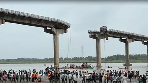 Vadodara | Eleven persons, including two siblings, were killed and nine others rescued as several vehicles plunged into the Mahisagar river after a portion of a four-decade-old bridge collapsed in Gujarat's Vadodara district on Wednesday morning, officials said.