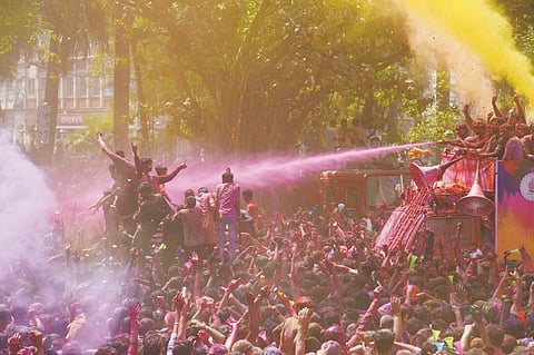 Indore | The festival of Rangpanchami was celebrated here on Sunday with gaiety as lakhs thronged Rajwada to participate in the `Ger' procession. Compared to last year, a large number of people came out with families to be part of the festivities. It was over thousands of kilograms of gulal that landed on the city streets when the procession concluded.