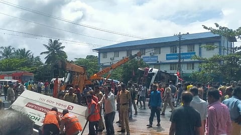 Kochi | A motorist was crushed to death after a private bus fell on him as its driver lost control and the vehicle overturned at a traffic signal near Panangad here on Sunday.