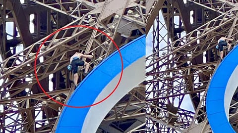 The shirtless man was seen scaling the 330-metre (1,083-foot) tall tower in the afternoon. It's unclear where he began his ascent, but he was spotted just above the Olympic rings adorning the second section of the monument, just above the first viewing deck.