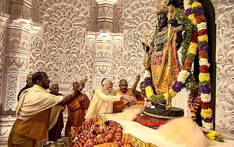 Ayodhya(UP) | An idol of the new Ram Lalla was consecrated at the Ayodhya temple on Monday, a landmark event led by Prime Minister Narendra Modi who also gave a clarion call to go beyond the grand mandir's construction to build the foundation of a "strong, capable and divine" India of the next 1,000 years.