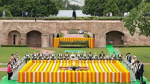 9.39 AM: After personally receiving world leaders at the Rajghat memorial, Prime Minister Modi led them in paying homage to Mahatma Gandhi.