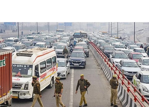 New Delhi | Traffic crawled at a snail's pace at many places in the Delhi-National Capital Region on Tuesday as police placed multiple layers of barricades and stopped the movement of vehicles at the Singhu and Tikri borders to thwart the farmers' march to the city Commuters faced a harrowing time on the roads, battling massive traffic snarls with Delhi being put under a heavy security cover with personnel in anti-riot gear deployed strategically and metal and concrete barricades regulating access to several key roads.