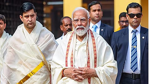 Ashoknagar (MP) | Prime Minister Narendra Modi arrived at Anandpur Dham in Ashoknagar district of Madhya Pradesh on Friday afternoon and performed puja at a temple inside the religious centre.