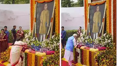 New Delhi | President Droupadi Murmu, Vice President Jagdeep Dhankhar, Prime Minister Narendra Modi and Lok Sabha Speaker Om Birla offered floral tributes at the statue of Babasaheb Ambedkar in the Parliament House Complex on the occasion of his birth anniversary on Sunday.