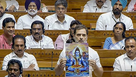 As Gandhi held up a picture of Lord Shiva, Speaker Om Birla reminded him that rules do not allow displaying placards in the House.