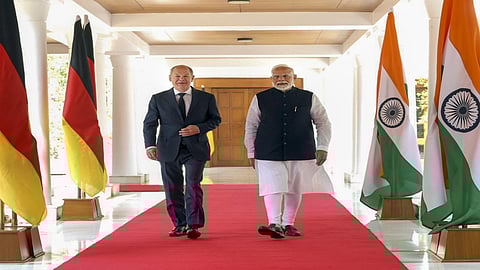 New Delhi | The Russia-Ukraine conflict was discussed in "considerable detail" during a meeting between Prime Minister Narendra Modi and German Chancellor Olaf Scholz here on Friday, with New Delhi reiterating that it is "not neutral" in this conflict and remains on the "side of peace", Foreign Secretary Vikram Misri said.