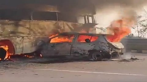 "There was a collision between the bus and the Swift car. So far it has come to light that a tyre of the bus burst, after which it went out of control and turned on the road. The Swift car coming from behind hit the bus and both vehicles caught fire," Mathura Senior Superintendent of Police Shailesh Pandey said.
